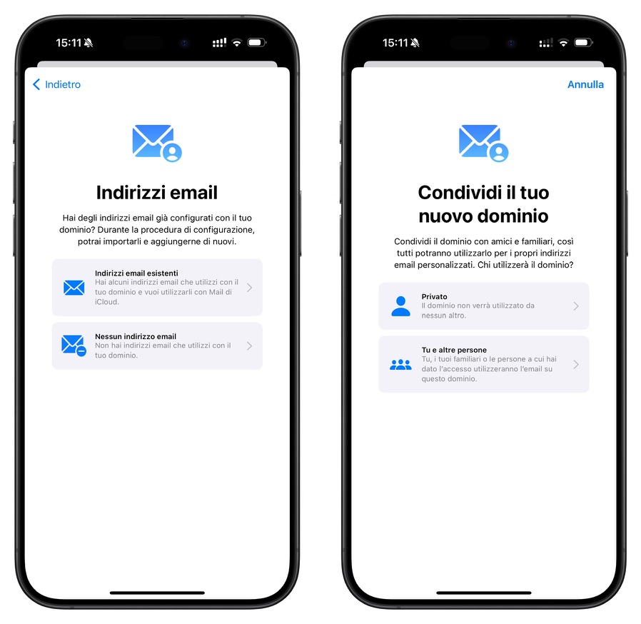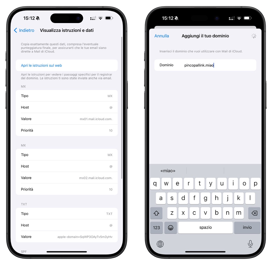 Vediamo quindi come configurare un dominio web su iCloud+ per utilizzare la posta elettronica personalizzata. Premettiamo che si può fare da iPad, iPhone e macOS. Io ho raccolto screen e passaggi da iPhone essendo veramente rapidissimo e con pochissimi tap da schiacciare.