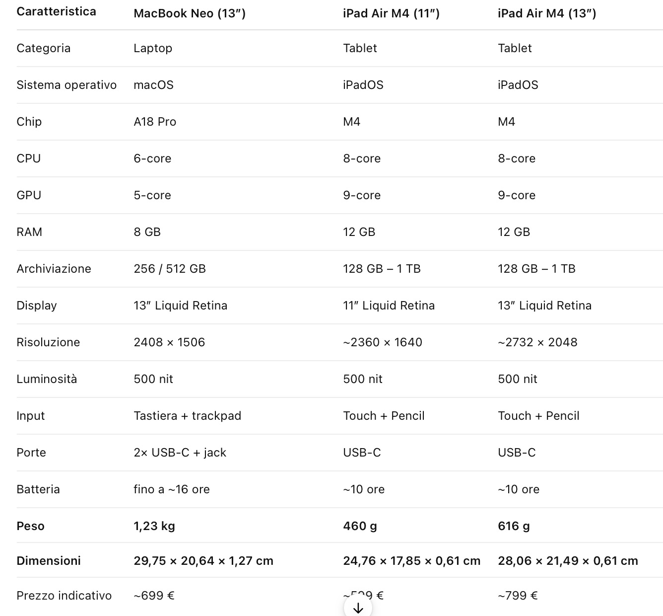Ok ma perché dovrei cambiare il mio attuale iPad Air M3 da 256GB, con cui mi trovo relativamente bene, per passare a questo nuovo MacBook Neo? Compariamo la scheda tecnica.