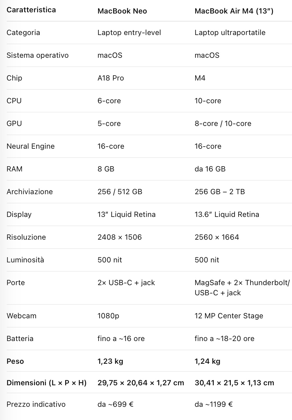 Prendiamo però il caso di comparare questo nuovo MacBook Neo con un attuale Air M4. Parliamo di prodotti di ingresso nelle rispettive fasce che però non diventano sovrapponibili anzi.