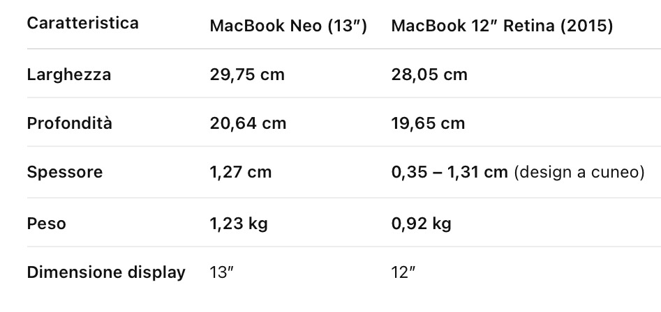 Lo definiamo interessante questo MacBook Neo? Per il momento è una novità. Non vi nego che lo proverei anche, tempo permettendo. Ma in un contesto personale in cui cerco la mobilità estrema, forse non fa al caso mio. Ci lamentiamo che Apple non abbia riportato indietro il MacBook 12, ma guardate che alla fine siamo lì eh anzi. Che poi non è che si stiamo discostando di tanto da un Air da 13” per dirla proprio tutta tutta.